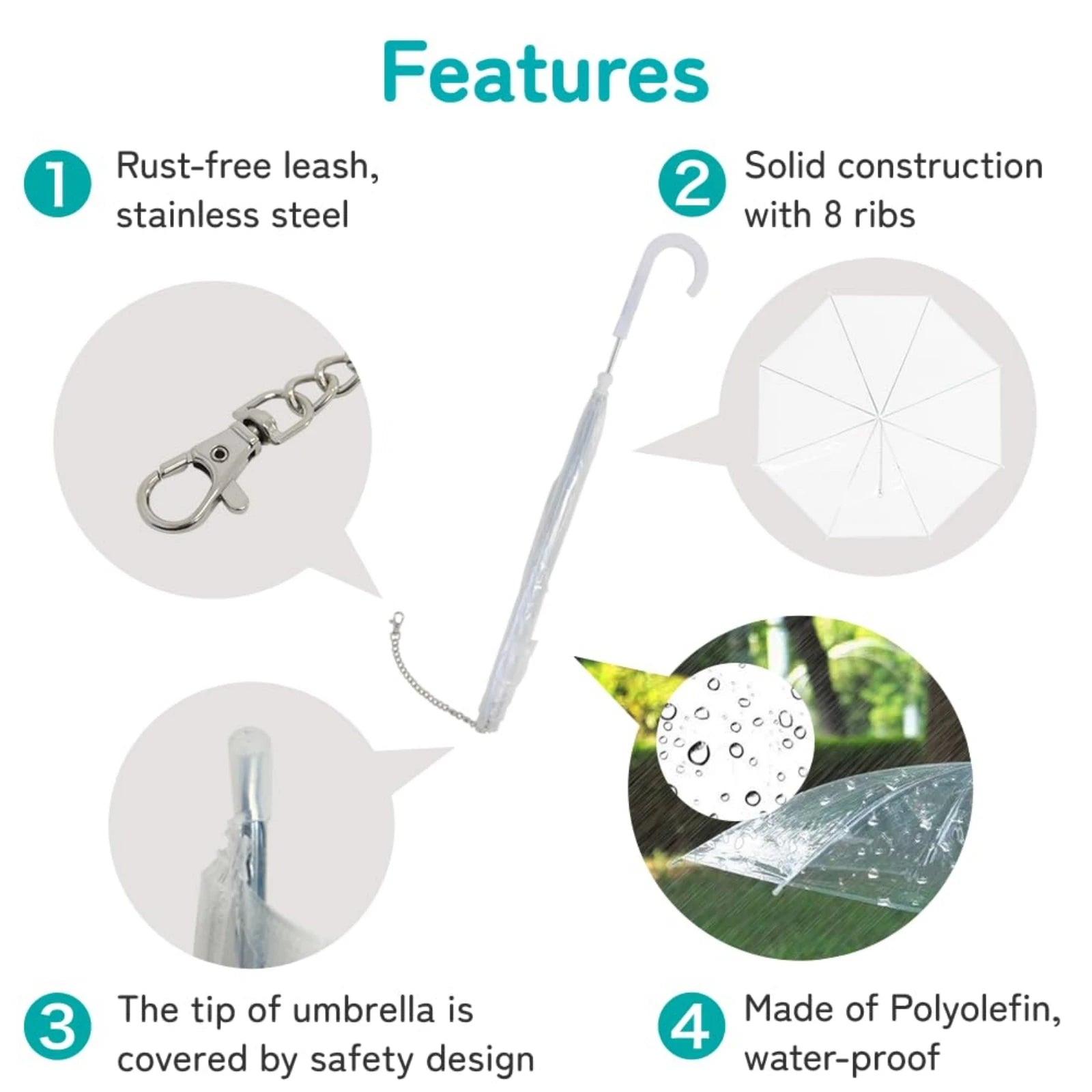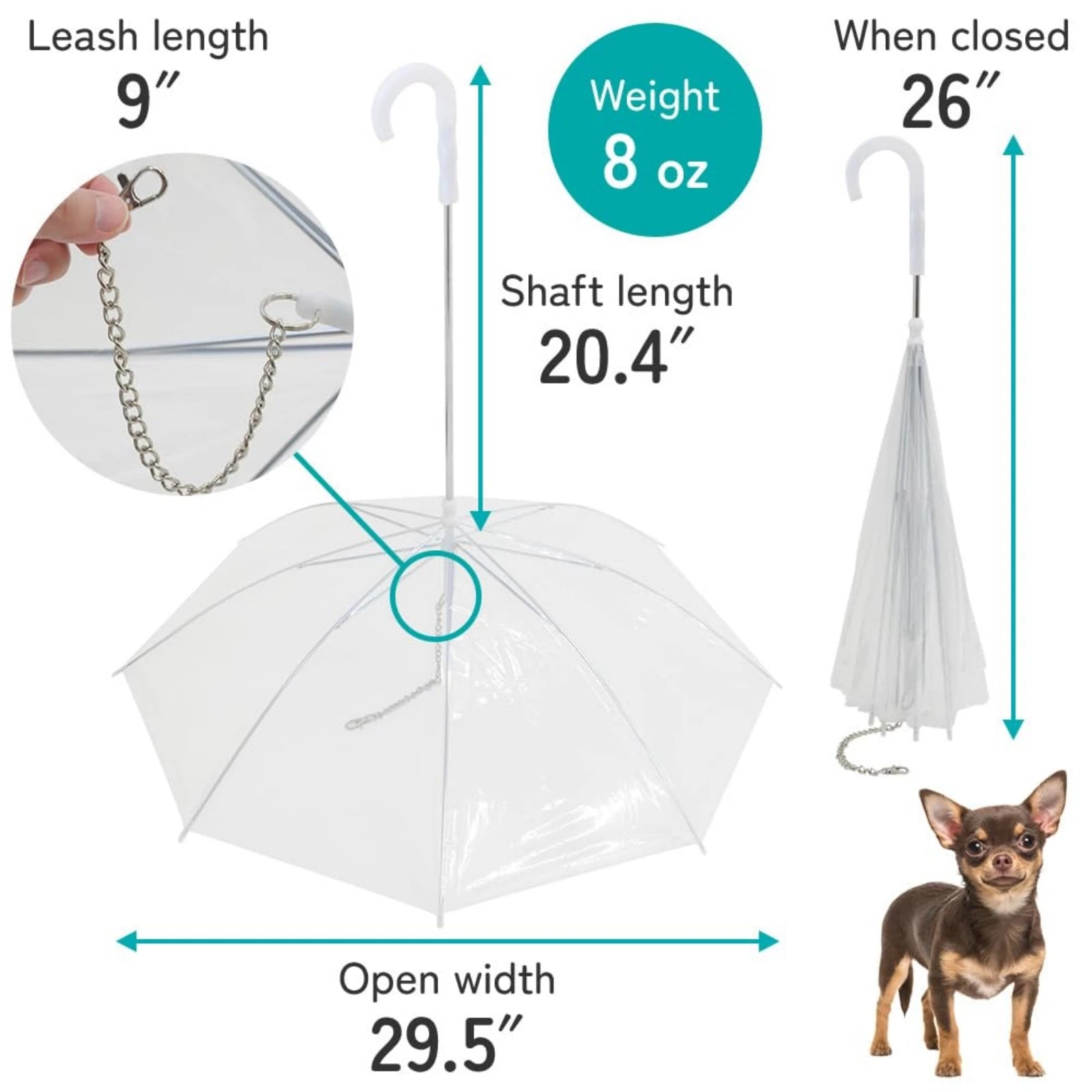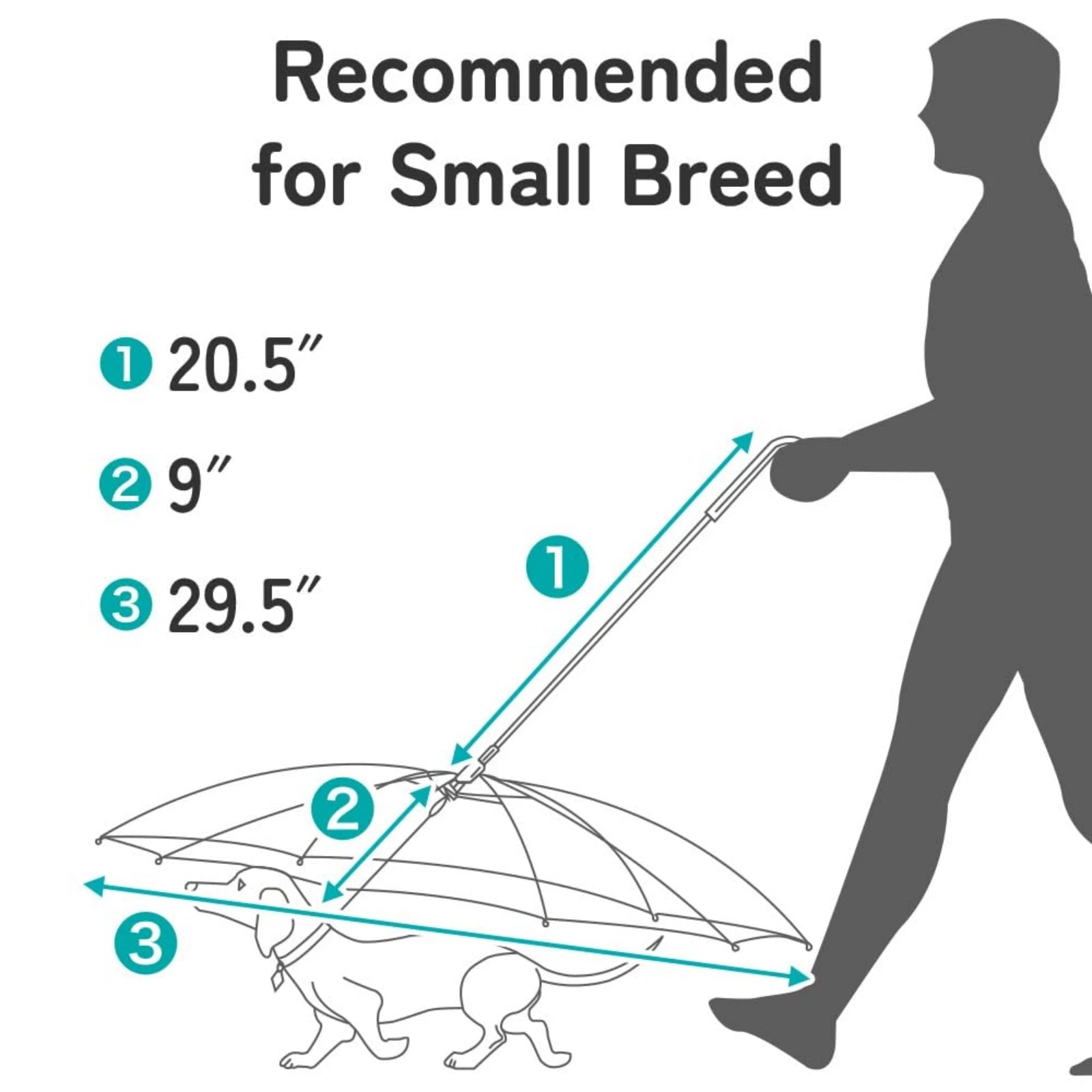 Convenient design: this pet umbrella is equipped with a 9inch long chain traction rope that can hold small size dogs less than 20inch in lengthThe width of the umbrella is approximately 29.5inch when in use.Please measure according to your pet's size.